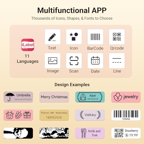 Imprimante Thermique Bluetooth avec APP – Connectez-vous via Bluetooth à iOS et Android. L’application déverrouille des modèles riches : plus de 1700 icônes, 21 bordures et 10 polices, codes-barres, QR codes, photos, horodatages. Les enseignants créent des étiquettes nominatives, les petites entreprises des codes-barres, et les amateurs de DIY personnalisent leurs cadeaux. L’application intuitive supporte 11 langues pour des résultats professionnels en minutes.