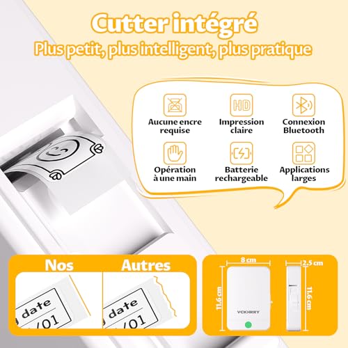 Compact et Pratique: Le cutter intégré permet une découpe plus nette et plus facile. Léger et portable, il permet d’imprimer et de découper d’une seule main. Vous pouvez imprimer des étiquettes n’importe quand et n’importe où à partir de votre appareil mobile.