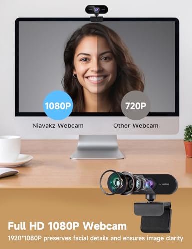 Niavakz Webcam PC 1080P, Full HD Webcam Streaming avec Microphone Anti-Bruit, Camera PC Grand Angle 80°,Web Cam USB Plug Play sous Windows MacOS Linux, pour PC/Mac/Portable/Tablette/Skype/Vidéo Zoom