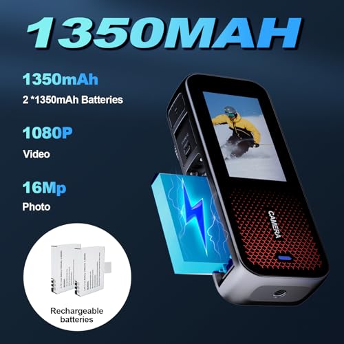 Autonomie prolongée caméra sport: Cet appareil caméra sport est doté d’une batterie haute capacité de 1350 mAh : chaque batterie fournit jusqu’à 200 minutes d’utilisation continue, sans besoin de rechargement fréquent.