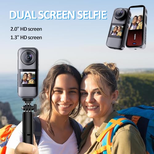 Appareil camera sport sportif à double écran Cet appareil caméra sport sportif est équipé d’un écran avant de 2,0 pouces et d’un écran arrière de 1,3 pouces, avec une interface simple et intuitive. L’écran avant permet de cadrer facilement les selfies, tandis que l’écran arrière offre une prévisualisation claire des prises de vue et un réglage facile des paramètres.