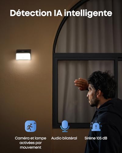 Caméra et applique murale tout-en-un : La caméra avec éclairage intégré surveille l’extérieur votre maison et éclaire vos espaces avec une luminosité de 300 lumens. La lumière brillante est confortable sans pour autant vous déranger, vous ou vos voisins, pendant la nuit. De plus, la lumière s’allume automatiquement en cas de mouvement.