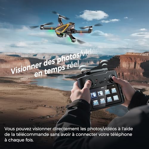 【Écran 4,5 pouces sur la manette】FPV instantané avec écran 4,5 pouces – Aucun téléphone nécessaire. La manette utilise un écran HD pour la transmission FPV en temps réel, sans smartphone ni application. Accédez facilement aux aperçus photo/vidéo locaux, formatez les cartes SD et volez sans latence, avec une transmission vidéo plus fluide et plus fiable pour une expérience de contrôle plus complète. (écran non tactile)