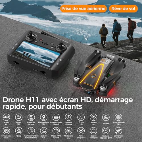 H11 GPS Drones avec Caméra Professionnel 4K pour Adultes (Radiocommande avec Écran) RC Drones FPV Pliable avec Moteur sans Balais, QuickShots, Longue durée de vol, Moins de 249g, C0