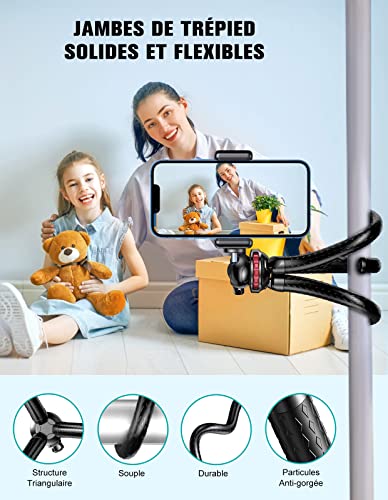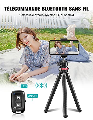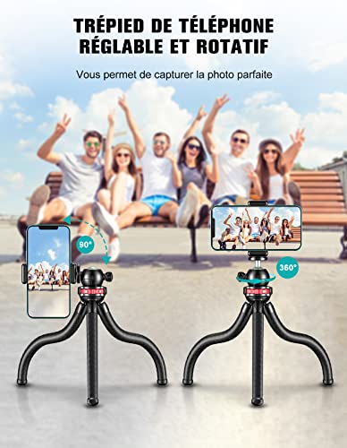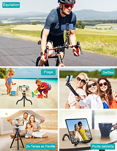 Compatibilité Universelle: Ce trepied flexible s’adapte aux téléphones portables d’une largeur de 5.49-8.59cm, compatible avec l’iPhone 17 Pro Max/17 Air/17/16/15 Pro Max/15 Pro/15 Plus/15/14/13/12/11/XS Max/XR/XS/X/SE/8 Plus/7, Galaxy S25 Ultra/S25+/S24/S23+/S22 Ultra/S21, HTC, etc. Un pas de vis 1/4″ intégré fonctionne avec un reflex numérique, un appareil photo de sport, un appareil photo numérique, etc. Le trépied également peut être utilisé comme support de tablette ou perche à selfie.