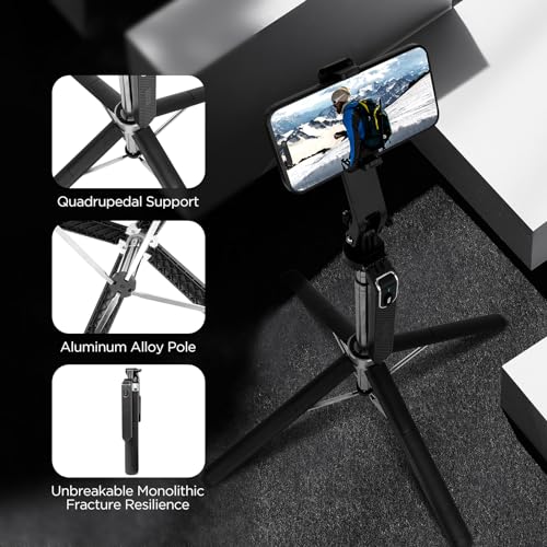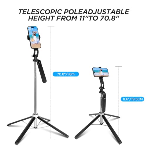 Le trépied est livré avec une télécommande Bluetooth(50mA) rechargeable pour une prise de vue sans fil dans un rayon de 10m, compatible avec la plupart des appareils IOS/Android. La conception télescopique permet une installation rapide et facile, s’étendant de 460mm à 1800mm pour répondre aux différentes exigences de prise de vue.