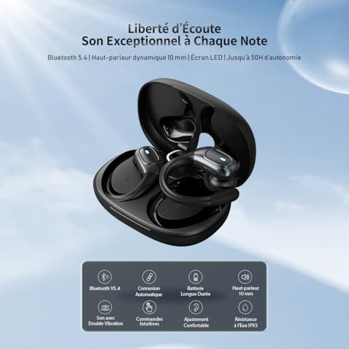 ÉCRAN LED FONCTIONNEL & CONNEXION BLUETOOTH 5.4 STABLE – Le boîtier des écouteurs bluetooth sans fil sport PORTENTUM affiche le niveau de charge et l’autonomie restante. Connexion rapide et stable via Bluetooth 5.4.