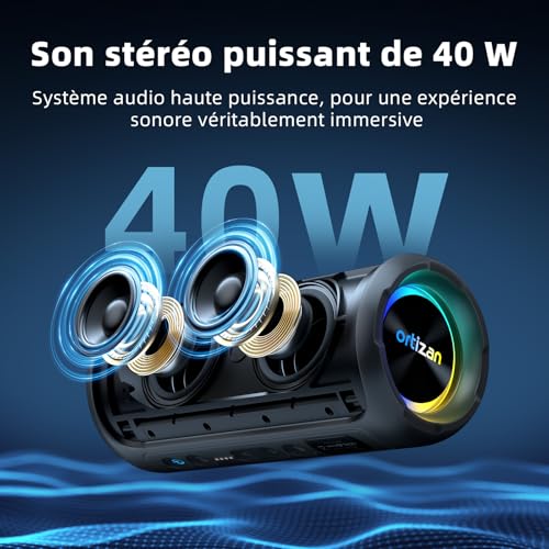 Ortizan Enceinte Bluetooth Puissante 40W avec Assistant Vocal, Haut-parleurs Bluetooth 5.3 Portable Rechargeable 30h d’autonomie, stéréo sans Fil étanche IPX7 avec Basses Profondes/lumière Del/TF/AUX