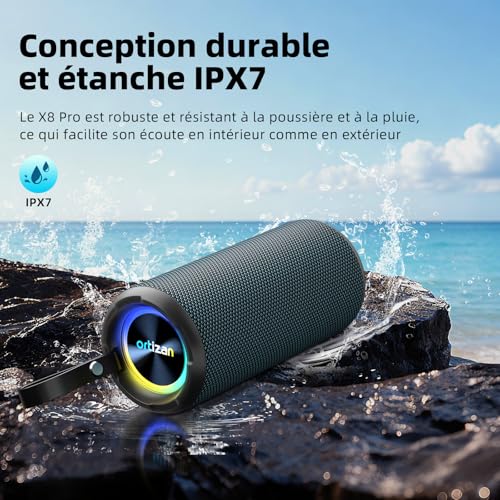 【Enceinte Bluetooth IPX7】 L’enceinte Bluetooth Ortizan est dotée d’une résistance à l’eau IPX7, ce qui permet de l’utiliser sans soucis au bord de la piscine ou sous la pluie.