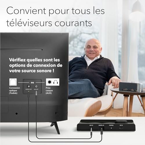 Compatible avec tous les téléviseurs : Il suffit simplement de connecter le socle à votre télévision via les entrées Toslink et AUX