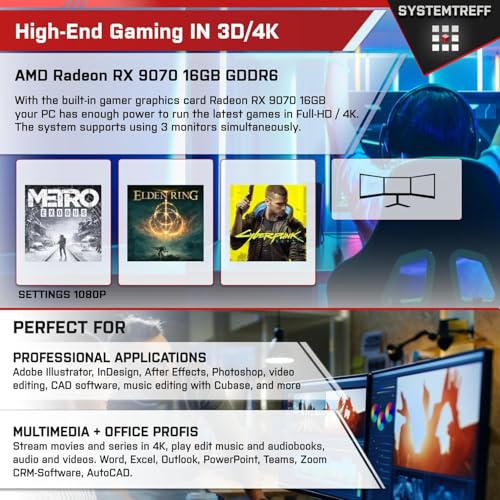 SYSTEMTREFF PC Gamer High-End AMD Ryzen 7 5800XT 8×4.8GHz | AMD Radeon RX 9070 16GB | 1To M.2 NVMe | 32Go DDR4 RAM | Windows 11 Pro | Ordinateur de Bureau WLAN pour Les Joueurs, Les Gamers & Streamer