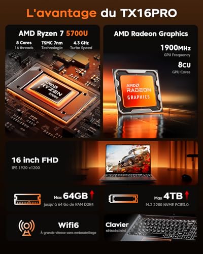 【2025 Dernier modèle TX16 PRO avec autonomie de batterie réglable】Acemagic 2025 ordinateur portable gaming est équipé d’un processeur 8 Core Ryzen 7 5700U, doté de 8 cœurs et de 16 threads, d’une fréquence turbo jusqu’à 4,3 GHz, d’un cœur graphique Radeon Graphics 2,0 GHz intégré en même temps Équipé d’une autonomie de batterie réglable, d’un fonctionnement flexible de la durée de vie de la batterie, d’un fonctionnement plus intelligent de divers logiciels de bureau, du montage vidéo et de la lecture d’une variété de jeux à grande échelle tout en améliorant l’efficacité du travail !