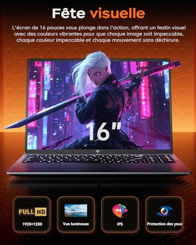 【Rapport écran large 16:10 et 1920*1200 60HZ FHD】Écran Full HD 16 pouces avec une résolution de 1920*1200 et un rapport écran large de 16:10, offrant un effet visuel plus spacieux, clair et délicat. La gamme de couleurs élevée et le taux de rafraîchissement élevé 60 HZ rendent l’image plus vive, réaliste, délicate et fluide. Chaque détail peut être présenté clairement avec une reproduction des couleurs extrêmement élevée. Qu’il s’agisse des magnifiques paysages du jeu ou des scènes de bataille féroces, ils peuvent vous être présentés avec le meilleur effet, vous aidant à prendre l’initiative dans le jeu