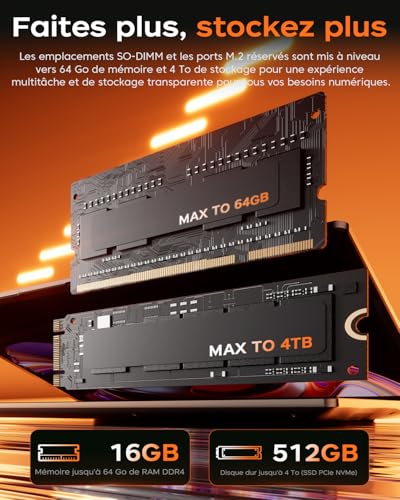 【Mémoire suffisante DDR4 16 Go-64Go Ram 512 Go, M.2 2280 NVME PCIE3.0, extensible jusqu’à 4 To】Nos ordinateurs portables sont équipés de 16 Go de mémoire DDR4 So-dimm 2666 MHz jusqu’à 64 Go et de 512 Go de SSD M.2, extensible jusqu’à 4 GB, et prend en charge PCIe3.0, offrant une transmission de données à haut débit et efficace, profitant d’une vitesse de jeu ultra-rapide et d’une expérience de transmission de données !