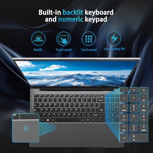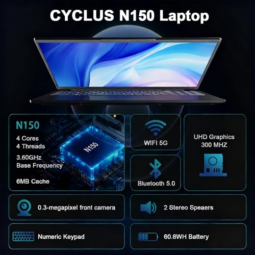 CYCLUS 2025 Ordinateur Portable Laptop 15.6 Pouces, N150 Processor(4C/4T, Boost 3,6GHz), RAM 32GB SSD 1TB Pc Portable Notebook, 13th Gen Twin Lake/8000Mah/Webcam/Comprend Un Cache Clavier AZERTY
