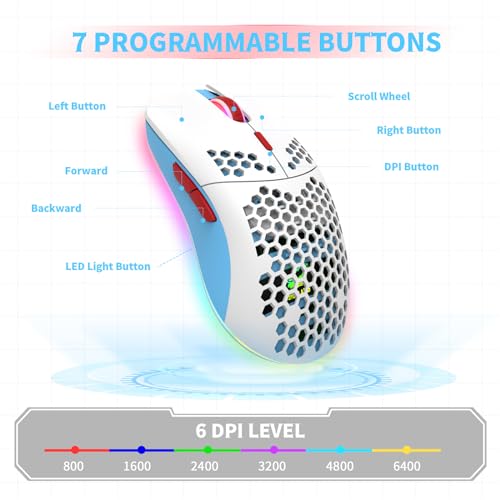 Wired Gaming Mouse, 6 RGB Lighting 6400 DPI Programmable USB Gaming Mice with 6 Buttons, Honeycomb Shell Ergonomic Design for PC Gamers and Xbox and PS4 Users -White Blue