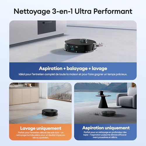 NETTOYAGE EFFICACE ET COMPLET : Le robot aspirateur est équipé d’un récipient à poussière d’une capacité de 340 ml et d’un réservoir d’eau d’une capacité de 250 ml. Il offre une autonomie de 150 minutes et une fonction de charge et reprise pour garantir des opérations de nettoyage en douceur. Le robot a un niveau sonore de fonctionnement minimum de 55 dB pour maintenir un environnement silencieux