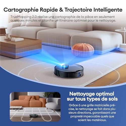 NAVIGATION LASER PRÉCISE : La navigation laser du robot aspirateur avec mappage permet d’éviter avec précision les obstacles même lorsqu’ils sont à seulement 1 cm de distance, assurant non seulement la couverture complète des activités de nettoyage, mais aussi la protection des meubles et des objets
