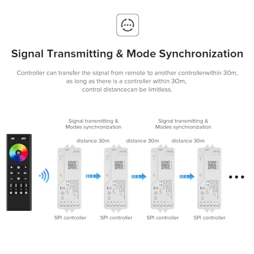 Télécommande RF : La télécommande RC03RFB adopte la technologie avancée de transmission sans fil RF 2,4 GHz. Chaque télécommande peut contrôler un ou plusieurs contrôleurs. Le contrôleur peut transférer le signal de la télécommande à un autre contrôleur dans un rayon de 30 m, tant qu’il y a un contrôleur dans un rayon de 30 m et la distance de contrôle peut être illimitée.