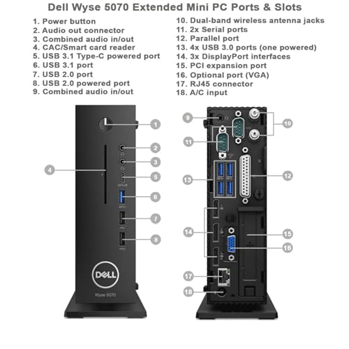 【Tech Specs】This Dell Wyse 5070 Mini Desktop Computer has 3 USB 2.0 (2 front, 1 interl) 6 USB 3.0 (1 front, 4 rear, 1 int) 1 USB 3.1 Type-C (front) 2 DisplayPort , which is convenient for you to connect and transfer data with external devices.