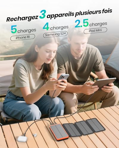 Capacité massive de 27000mAh : Peut recharger un iPhone 13 jusqu’à 7 fois, un Galaxy S22 jusqu’à 5 fois, une tablette jusqu’à 3 fois. Idéal pour une autonomie prolongée en voyage ou en plein air.