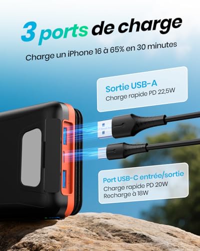 Charge ultra-rapide 22,5W : Profitez d’une vitesse de charge impressionnante – jusqu’à 22,5W, soit 3 fois plus rapide que les chargeurs solaires classiques. Recharge un iPhone 14 à 62 % en seulement 30 minutes. Complètement rechargée en 5 heures avec un adaptateur PD 20W (non inclus).