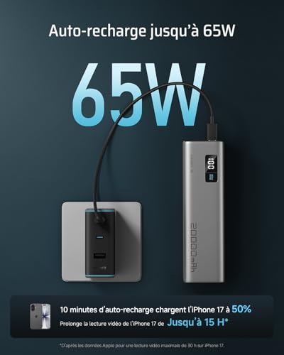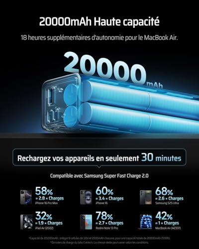 【Charge bidirectionnelle 65W MAX, recharge ultra-rapide】Prend en charge la charge bidirectionnelle 65W MAX sur un seul port. En seulement 30 minutes, rechargez un MacBook Air à 55%, un iPhone 15 Pro Max à 56% ou un Samsung S24 Ultra à 68%. La power bank elle-même peut être entièrement rechargée en 1 heure et 40 minutes, idéale pour les réunions professionnelles ou les voyages avec correspondance. Restaurez rapidement l’énergie de votre téléphone, ordinateur portable, tablette, et même de votre drone DJI Air.