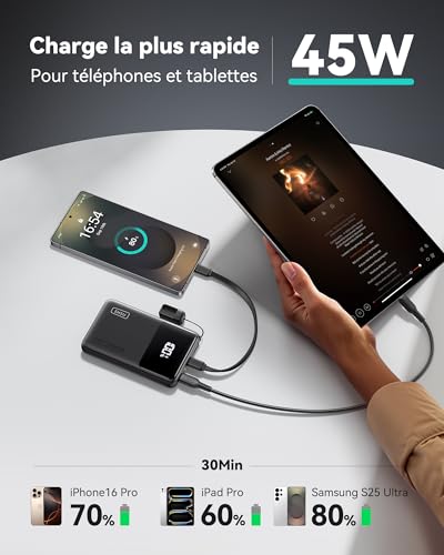 Charge rapide à pleine puissance 45 W pour les derniers iPhone 16 et Samsung S24 : cette batterie externe offre une puissance de sortie pouvant atteindre 45 W et prend en charge les protocoles PD, QC et autres protocoles de charge rapide. En seulement 25 minutes, elle recharge votre iPhone 16 à 63 % et votre Samsung S24 Ultra à 73 %.