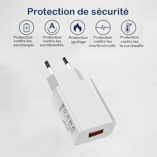CHARGE RAPIDE 18W 3.0 : Entrée : 100-240V 50/60Hz, Sortie : 12V1.5A / 9V2A / 5V3A. Le chargeur rapide charge rapidement vos appareils compatibles QC 3.0 de 0 % à 50 % en 30 minutes, soit 50 % plus rapidement que les chargeurs traditionnels.