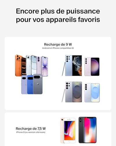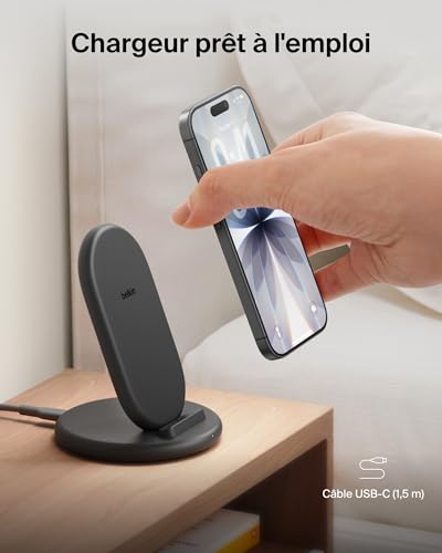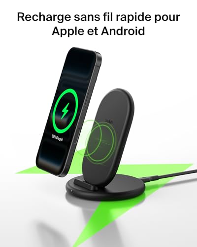 « Profitez d’une recharge Qi rapide et pratique sur tous vos smartphones. Ce chargeur vous offre une recharge sans fil fiable et efficace, le tout concentré dans un design fin qui s’intègre à tout type d’intérieur, sur un bureau ou une table de chevet. Gardez vos appareils rechargés et prêts à l’emploi, sans enchevêtrement de câbles. * Revêtement (câble et composants en silicone exclus) contenant au minimum 85 % de plastique recyclé post-consommation. ** Si votre dispositif est endommagé par une recharge électrique alors qu’il est correctement connecté au chargeur, Belkin le réparera ou le remplacera à hauteur de 2 000 €. Belkin est la marque leader du marché des accessoires qui offre des solutions de haute qualité et innovantes depuis plus de 40 ans. Compatibilité : Compatibilité universelle avec les smartphones Apple et Android compatibles Qi, comme l’iPhone 17, iPhone 16, iPhone 15, iPhone 14, iPhone 13, iPhone 12, iPhone X, iPhone 8, Google Pixel 10, Pixel 9, LG, Huawei, Xiaomi, Oppo, Galaxy S24, Galaxy S25, Galaxy S8, Galaxy S9, Galaxy Note 10, Galaxy Note 20 Produit fabriqué à partir de 85 % de PCR et emballage dépourvu de matériau plastique Garantie limitée de 2 ans Garantie sur les matériels connectés à hauteur de 2 000 € Contenu de l’emballage : Support de recharge sans fil BoostCharge Câble USB-C vers USB-C (1,5 m) » * Revêtement (câble et composants en silicone exclus) contenant au minimum 85 % de plastique recyclé post-consommation. ** Si votre dispositif est endommagé par une recharge électrique alors qu’il est correctement connecté au chargeur, Belkin le réparera ou le remplacera à hauteur de 2 000 €. Belkin est la marque leader du marché des accessoires qui offre des solutions de haute qualité et innovantes depuis plus de 40 ans. Spécifications : Certifications Qi v.1.3, 9 W, BPP, EPP et Samsung PPDE à 9 W S23 (ou version ultérieure) : 9 W PPDE iPhone : 7,5 W Autres appareils Qi EPP / BPP : jusqu’à 9 W Compatibilité : iPhone 17, iPhone 16, iPhone 15, iPhone 14, iPhone 13, iPhone 12, iPhone X, iPhone 8, Google Pixel 10, Pixel 9, LG, Huawei, Xiaomi, Oppo, Galaxy S24, Galaxy S25, Galaxy S8, Galaxy S9, Galaxy Note 10, Galaxy Note 20 Produit fabriqué à partir de 85 % de PCR et emballage dépourvu de matériau plastique Garantie limitée de 2 ans Garantie sur les matériels connectés à hauteur de 2 000 € Contenu de l’emballage : Support de recharge sans fil BoostCharge (9 W). Câble USB-C vers USB-C (1,5 m).