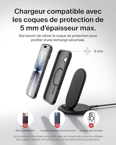 PRODUIT COMPATIBLE AVEC LES COQUES : ce produit a fait l’objet de tests approfondis dans le cadre de notre processus qualité Belkin SmartProtect. Vous profitez ainsi d’une recharge sécurisée sans retirer la coque de protection (moins de 5 mm d’épaisseur).