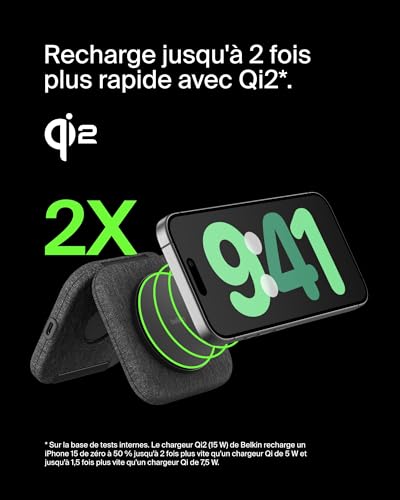 RECHARGE RAPIDE QI2 : rechargez rapidement jusqu’à 15 W votre iPhone ou tout appareil compatible Qi2 avec ce chargeur compatible MagSafe. La technologie Qi2 offre une recharge sans fil 2 fois plus rapide*.