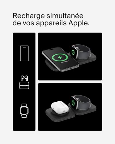 RECHARGE SIMULTANÉE DE 2 APPAREILS : profitez d’une recharge rapide et simultanée de votre iPhone, Apple Watch et AirPods. Le voyant LED se trouvant sur la base du chargeur vous indique l’état de recharge de vos Airpods.