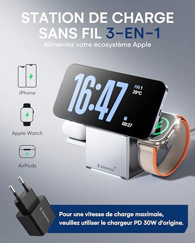 ZEEHOO Station de Charge 3 en 1 pour Apple, iPhone, certifié Qi2, Support de Chargeur Rotatif sans Fil pour iPhone 16, 15, 14, 13, 12, Apple Watch, AirPods (Chargeur USB-C Inclus)