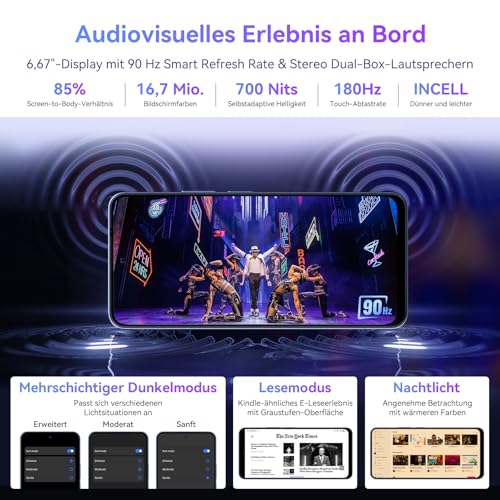 Expérience visuelle captivante : l’écran HD+ IPS 90 Hz de 6,67 pouces du smartphone OSCAL Tiger 13 Android 14 est très lumineux jusqu’à 700 nits et offre des couleurs vives, vives et des détails nets, même en plein soleil. Que vous regardiez des vidéos, jouiez à des jeux exigeants ou que vous fassiez défiler les réseaux sociaux, grâce à l’étalonnage précis des couleurs et au contraste net, les scènes sur le smartphone gaming Tiger 13 ressemblent à la vraie vie. Grâce à son grand angle de vision et au filtre de lumière bleue qui protège les yeux, les couleurs restent fidèles à l’intérieur et à l’extérieur.