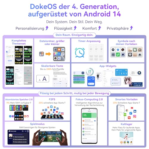 【Doke OS 4.0 et Android 14 pour une expérience utilisateur intuitive】Le smartphone OSCAL Tiger 13 Android 14 avec Doke OS 4.0, basé sur Android 14, élève l’utilisation à un nouveau niveau. La vitesse optimisée, la navigation transparente et l’interface personnalisable offrent une expérience personnalisée et efficace. Le smartphone Android 14 offre une sécurité améliorée, des mises à jour régulières, des fonctions d’économie d’énergie intelligentes et des contrôles avancés de protection des données. Les widgets intelligents fournissent des informations importantes en un coup d’œil afin que vous puissiez profiter d’une utilisation fluide, sûre et personnalisée.