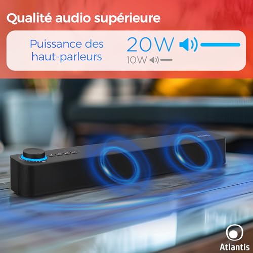 ATLANTIS Soundbar PC 20 W, Boîtier PC, Jack 3,5 mm + Bluetooth 5.3 pour Smartphone, FireTV, Tourne-disque, Batt. 2400 mhA, Radio FM, Haut-parleur PC, portable, TV, Smartphone Dim 420 x 60 x 74 mm Noir