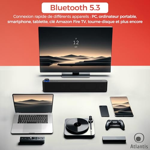 Soyez le premier à laisser votre avis sur “ATLANTIS Soundbar PC 20 W, Boîtier PC, Jack 3,5 mm + Bluetooth 5.3 pour Smartphone, FireTV, Tourne-disque, Batt. 2400 mhA, Radio FM, Haut-parleur PC, portable, TV, Smartphone Dim 420 x 60 x 74 mm Noir” Annuler la réponse