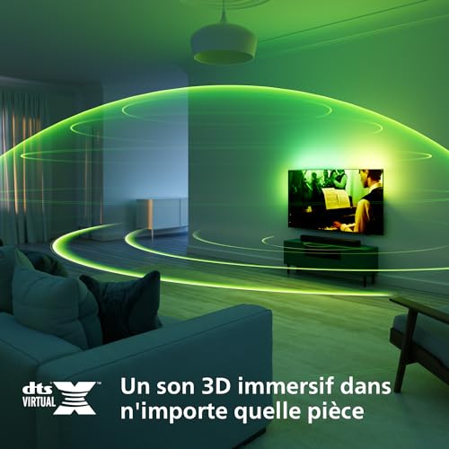 DTS Virtual:X : transforme le son de la TV pour une expérience sonore virtuelle 3D ! Le système fonctionne n’importe où sans enceintes supplémentaires : activez-le avec la télécommande de la barre de son ou l’application Philips Home Entertainment