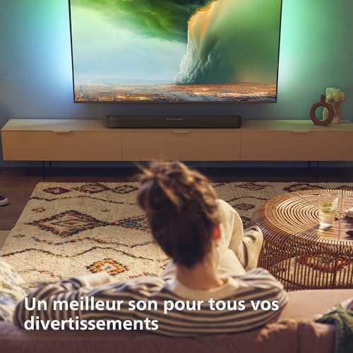 Profitez d’un son immersif avec cette élégante barre de son. Parfait compagnon des téléviseurs Ambilight, elle sublime vos contenus avec ses canaux 2.1 et la technologie audio immersive, offrant quatre modes d’égalisation, notamment l’amplificateur de dialogue pour des voix ultra claires. Son design ultra fin de 37 mm permet de l’installer sous les téléviseurs Ambilight, alors que les supports de fixation murale amovibles procurent des options différentes d’installation. Profitez d’un son en trois dimensions avec Dolby Atmos et d’une expérience sonore virtuelle 3D, que vous pouvez régler avec l’application Philips Home Entertainment ou la télécommande. Avec HDMI eARC et Philips EasyLINK, synchronisez la télécommande de votre téléviseur pour une commande fluide. La compatibilité Bluetooth® LE Audio garantit des connexions plus stables pour le streaming et les entrées multipoints confèrent une connectivité polyvalente. Sublimez votre expérience avec l’application Philips Home Entertainment, permettant l’accès aux modes d’égalisation, la sélection de la source et l’activation de la fonction InfraBass pour une meilleure réponse des basses. Transformez votre expérience audio sans effort avec cette barre de son à la pointe de la technique.