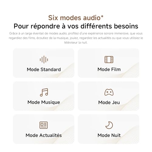 【6 modes audio】 Propose une variété de modes audio pour répondre à différents besoins : mode standard, mode film, mode musique, mode jeu, mode actualités et mode nuit. Que vous regardiez des films, écoutiez de la musique, jouiez ou suiviez l’actualité, la Xiaomi Soundbar Pro 2.0 vous permet de profiter d’une expérience sonore immersive.