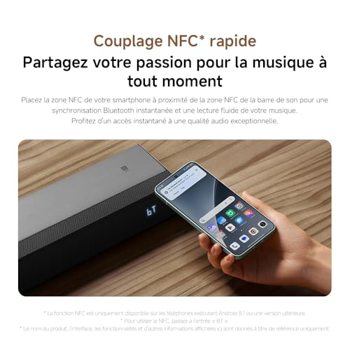 【Multiples méthodes de connexion et jumelage NFC】 Compatible avec une large gamme d’appareils. Propose des options de connexion pratiques aux téléviseurs, ordinateurs et smartphones via optique, coaxial, HDMI (ARC) et Bluetooth pour répondre à vos besoins de divertissement. Tenez la zone NFC de votre smartphone près de la zone NFC de la barre de son pour un jumelage Bluetooth instantané et une lecture de musique fluide. Profitez d’un accès instantané à un son incroyable sans étapes complexes.