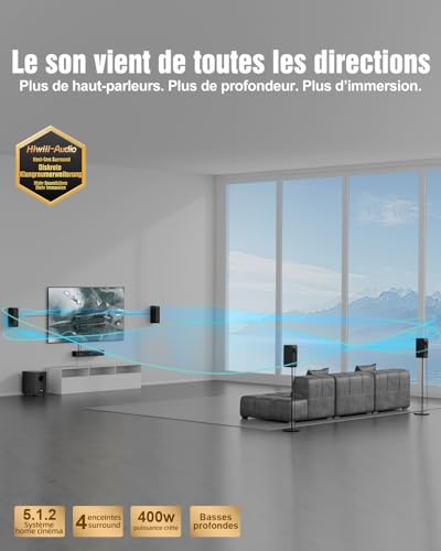 Hiwill-Audio 5.1.2CH Barre de Son TV, 4 Haut-Parleurs Surround Virtuels, 400 W de Puissance crête, Home Cinema Enceintes pour Téléviseur, Caisson de Basses, Arc/Optique/BT 5.3/AUX/USB, HiPulse N512
