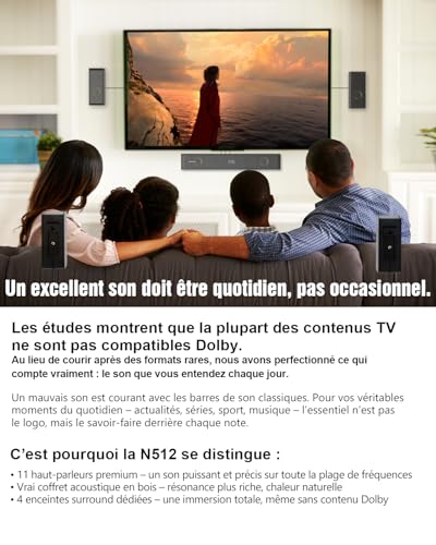 Barre de son 5.1.2 immersive pour une expérience Home Cinema: Équipée de 11 haut-parleurs de haute performance — caisson de basses filaire 5,25″, quatre enceintes surround et deux unités orientées vers le haut — cette barre de son délivre des basses profondes et un son surround virtuel enveloppant, pour des films et de la musique encore plus immersifs. Compatible avec téléviseurs, ordinateurs et autres appareils multimédia. Installation simple et connexion BT rapide, sans réglages compliqués.